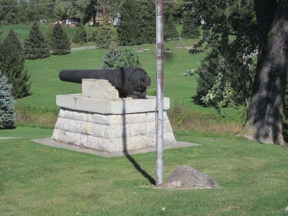 There is a large cannon and a nearby bronze plaque in the Hazelwood Cemetery in Grinnell. The plaque is on a small granite boulder near a flagpole. It refers to the donation of the flagpole. The cannon is a 6.4 inch Navy Parrott rifle made at the West Point Foundry in 1863. The cemetery, 120 1st Ave. W, is in the SW area of town. Take 1st Avenue west from Highway 146 to the cemetery. The cannon is located on top of a hill to the right shortly after entering the cemetery. Photos taken 10/8/17.