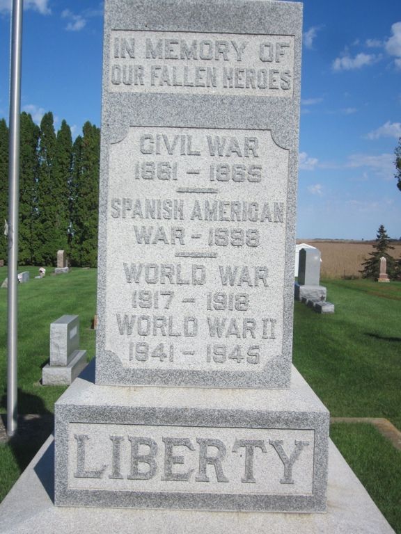 This monument honors veterans of the Civil War, Spanish American War, World War and World War II. It is granite and about 14 feet high. This cemetery is in the northern part of the county – take county road T58/320 Avenue ½ mile west of Highway 63. The cemetery is across the road from the Sheridan Methodist Church. Photos taken 10/9/17.
