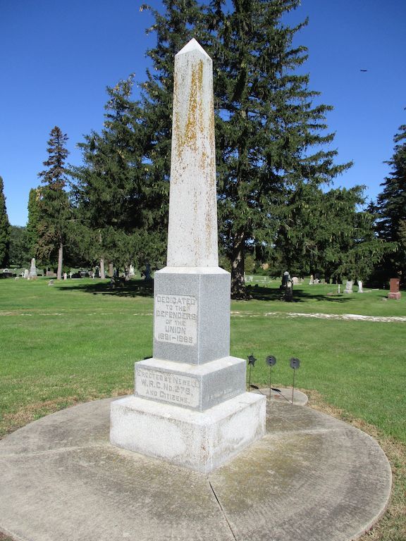 This is a 12 foot obelisk with inscription "Dedicated in memory of unknown dead" on the back of the monument. The inscription on its front is shown below. The nearby cannon is in bad shape - it is inverted and has had a crack repaired and is held together with metal straps. It is a 24 pounder flank howitzer, M1844 cast at the Cyrus Alger & Co. foundry. The cemetery is in the NE part of town. Take Fulton Street through the business district to Jensen and then turn east to the cemetery. The monument and cannon are in the center area of the cemetery. The cannon is about 100 feet SE of the monument. Photos taken 5/4/14.