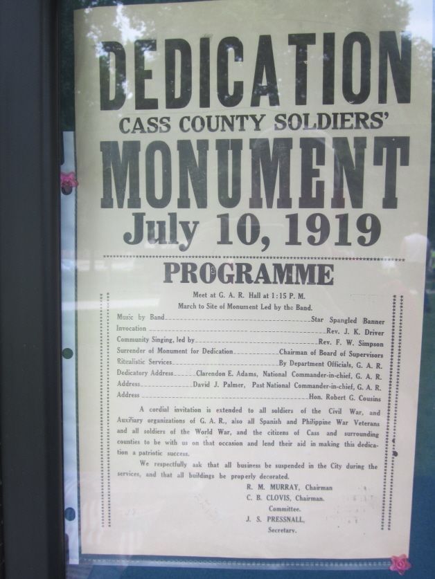This is an impressive 62 foot monument with four bronze soldiers and sailors and bronze plaques listing Cass County veterans. Lady Liberty sets on top of the monument. The statues represent the infantry, artillery, Navy and WWI. There are bronze plaques on each side of the monument representing soldiers from the area. To commemorate restoration work, there was a re-dedication of the monument on 7/13/13 with a photo of members from the Kinsman and Kirkwood SUVCW Camps in Atlantic and Council Bluffs who conducted the ceremony. The original dedication was July 10, 1919 - the poster from that ceremony is shown. The monument commemorates veterans from the Civil War, Spanish-American War and WWI. There is also a more modern Veterans Monument. The location is in a park south of the business district and off Highway 6. Photos taken 7/13/13, 8/19/14 and 6/29/18. Also shown is an old photo, thanks to David Shedlock, with a cannon (non-Civil War) that is now missing.