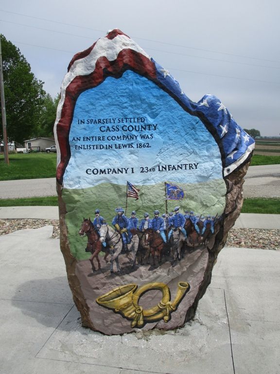 Company I of the Iowa 23rd was mustered on this spot at the courtyard square at Lewis, the former county seat of Cass County. All 97 men in Company I were from Cass County. The Iowa 23rd was best known for their heroic action at Big Black River on May 17, 1863 in the Vicksburg Campaign. The SUVCW Kinsman Camp #23 presented the monument to the City of Lewis. The SUVCW dedication was September 27, 2008. The location, now known as East Park, is at Fifth and Court on the east side of town. Photos taken 9/27/08. On a subsequent visit it was noted that an impressive new Veterans memorial was constructed in the NE corner of the Park. This includes a "Freedom Rock" by artist Ray "Bubba" Sorensen - one side of the rock has a painting of the 23rd Iowa. This photo was taken 5/12/18.