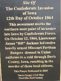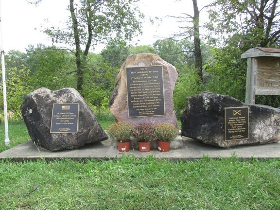 On October 12, 1864, a band of Confederate guerillas or bushwhackers, dressed in Federal uniforms, crossed into Iowa and engaged in murder and robbery in Davis County. This was the northern most Confederate incursion in Federal territory in the war. It consists of three boulders with plaques from the Sons of Union Veterans and the Sons of Confederate Veterans. It is directly south of Bloomfield on Lilac Avenue, 4 miles south of Highway 2. The first photo was taken 9/25/18 - the others 10/13/07.