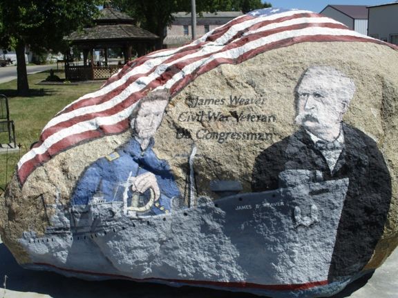 James Weaver enlisted in the 2nd Iowa Infantry Regiment as a Private and eventually became a Colonel and commanded the regiment. Later he became a brevet Brigadier General. After the war, he was active in Iowa politics and twice ran unsuccessfully for President as the nominee for the Greenback Party in 1880 and the Populist Party in 1892. Today the impressive Weaver home is a bread and breakfast. There is also a plaque in a small park directly across the street from the home - the GPS reading is set on the plaque. The plaque and home are on Highway 63 in the north part of Bloomfield. Photos taken 11/26/08 and 9/25/18. In 2016 a Freedom Rock was painted by Ray "Bubba" Sorensen that features General Weaver on the west side of the Rock. It is located on Main Street in Drakesville, just a few miles NW of Bloomfield. This photo taken 8/21/20.