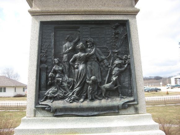 This is a striking statue of Abraham Lincoln, standing 7 feet, 6 inches, with four bas relief sculptures of Civil War scenes. The sculptor was George Bissell. The monument was a gift of Gov. Larrabee at a cost over $5000. The monument was completed in 1902 and dedicated in 1903. It is in a small park on Highway 18 just east of the business district in historic Clermont. The panels are, on the east, "Leaving for War"; on the north, a scene from Shiloh; on the south, a scene from Mobile Bay with Admiral Farragut; and on the west, a scene from Appomattox. The first two had images of local soldiers. Thanks to Jeanenne Cullop for sending a copy of the 12/3/1902 Hartley Herald with historic information about this monument. Photos taken 3/25/08.