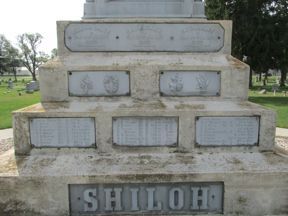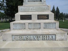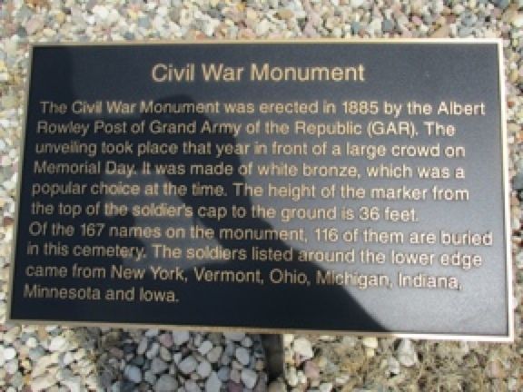 This is a 36 foot monument of white bronze (zinc) in an impressive setting at the entrance to Union Cemetery. 167 soldiers are inscribed on the four sides and there are panels of Washington, Lincoln, Grant, and a common soldier. The white bronze has had restoration efforts in the past and looks good. There is a marker indicating that funds were left in an estate to maintain the monument. Union Cemetery is on the NW side of town. From Highway 3, take 19th Street north to the cemetery. The first photo was taken 7/31/10 -the others on 9/16/19.