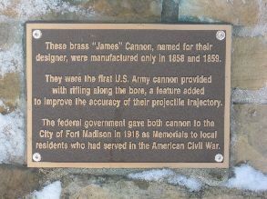 These are 3.80-inch bronze James rifles cast at the Ames Manufacturing Co. They are attractively displayed in Riverview Park in Ft. Madison. There are plaques on the back of each cannon mount. The cannons can be found near the flags and the attractive Veterans Memorial in the park. The first photo was taken 10/5/20 - the plaque photos on 12/29/07.