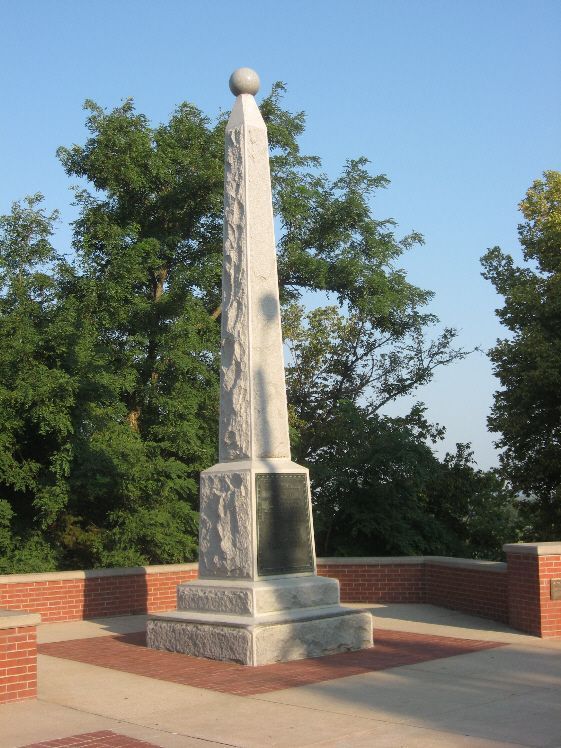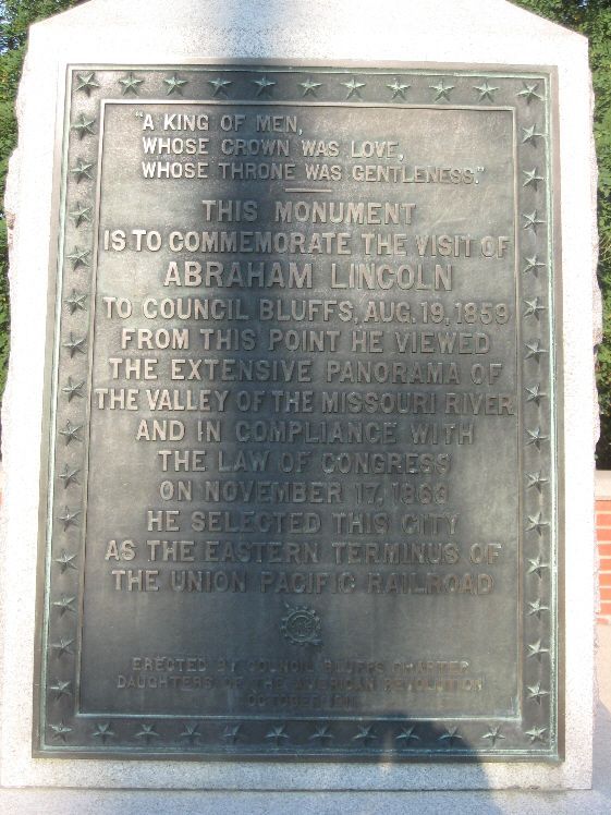 This monument was erected in 1911 and commemorates Abraham Lincoln’s visit to Council Bluffs in 1859 to consult with Grenville Dodge regarding a transcontinental railroad. The monument has a bronze plaque and is about 25 feet high. This spot overlooks the Missouri River and Omaha. Dodge told Lincoln that the best route was "Westward from Council Bluffs". Take Oakland Avenue north off Kanesville Blvd/Highway 6. The monument is to the left of the entrance to Fairview Cemetery. The photos were taken 9/1/08.