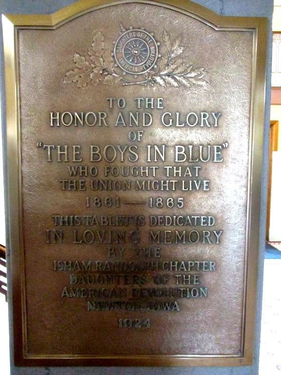 On the first floor of the Jasper County Courthouse in Newton are two plaques. The "Boys in Blue" plaque was dedicated by the DAR in 1924. It is brass, 20 inches wide and 29 inches high. The Gettysburg Address plaque was dedicated by the WRC in 1927. It is also brass, 22 inches high and 25 inches wide. The Courthouse, on the town square, was completed in 1911 and seems very well maintained. It has an impressive 3 story rotunda and the plaques fit in very well with the surroundings. Photos taken 10/4/22.