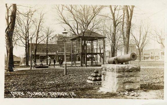 Marion's Central Park has a Civil War soldier monument and a cannon. The soldier is on a 12 foot granite base and has 4 bronze plaques on each side. Besides the ones shown, there are plaques with the GAR and WRC emblems. The plaques have some graffiti. The soldier is painted gray. The monument was dedicated in 1914. The cannon is a 24 pounder flank howitzer, M1844, cast at Cyrus Alger & Co. in 1863. It also has graffiti. According to SUVCW member James Johnston, there used to be a second cannon but it was melted down for scrap in WWII. The park is located in the central business district off Business Highway 151. Photos taken 8/23/19. The final image is a copy from an old postcard showing the cannon and park scene - thanks to Danny Krock for providing this.