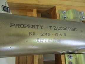 This building is a memorial with several wonderful Civil War items, including the stained glass memorial window designed by Grant Wood. The window includes a 16 foot "Lady of Mourning" and life size soldiers from the Revolutionary War through WWI. The window was completed in 1929. There are several plaques and a 12 pounder bronze mountain howitzer, M1835, cast at Cyrus Alger & Co. in 1862. It has an inscription saying it was captured in Philadelphia, Tennessee in 1863. There are two small military museums with military artifacts on each side of the lobby. The building is on an island in the Cedar River just west of the business district. Photos taken 3/11/08, 5/1/09, and 8/23/19.
