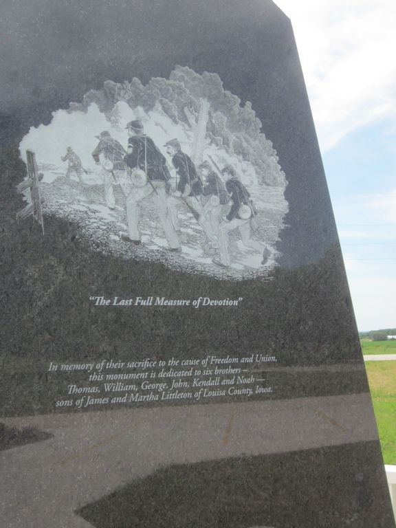This impressive monument was dedicated June 14, 2016 to the memory of the six Littleton Brothers who lost their lives in the Civil War. They perished due to death in battle, illness, accident and as prisoner of war. The monument is black granite and about 11 feet in height. The front has an etching representing the brothers, Thomas, William, George, John, Kendall and Noah. The back side has a history of the brothers and their family. The left side lists the brothers and their regiments. Thanks to Tom Woodruff and Ed Bayne for uncovering this amazing story of the brothers and leading the effort to recognize them with this monument. It is located on Highway 99 at the entrance to the Toolesboro Indian Monument Historical Site, just outside the small town of Toolesboro. Photos taken 6/14/16, 6/25/16 and 8/12/20.