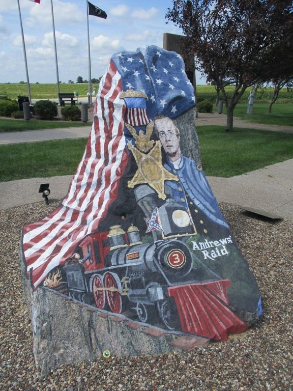 There is an impressive Veterans memorial at the entrance to Grandview. It was dedicated July 4, 1991 led by the Louisa County Vietnam Veterans. It includes a Freedom Rock painted by artist Ray "Bubba" Sorensen. The west side of the Rock is dedicated to William Reddick. He was one of the Andrews' Raiders - this was also called the Great Locomotive Chase. Reddick was captured by the Confederates but later released in a prisoner exchange. He was one of the first recipients of the Medal of Honor. He was a member of the Ohio 33rd Infantry, but settled in this region after the War and is buried in the Letts Cemetery only a few miles away. Please see more information listed under Letts in Louisa County. This memorial is located at the intersection of Highways 61 and 92. The photo of the Rock was taken 8/12/20. The photo of the helicopter and flags was taken 1/9/08.