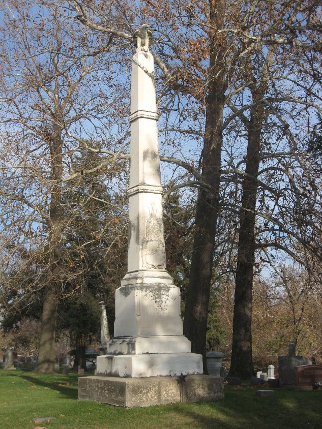 This area includes a Parrott cannon, many tombstones of CW veterans, and the memorial to General Samuel Rice. There is also a red, white and blue “GAR” sign on the lawn. The cannon is a 4.2 inch Navy Parrott rifle cast at West Point Foundry in 1863. The weight is marked as 3460 pounds. It was donated to Phil Kearney GAR Post #40 in 1902. It was part of the battery of U.S.S. Vicksburg and fired 101 times through March, 1865. Many of the tombstones are discolored. Samuel A. Rice was the Colonel of the 33rd Iowa Infantry. In August of 1863 he was promoted to Brigadier General. He was severely wounded at Jenkins Ferry, Arkansas and died July 6, 1864. His memorial, a 30 foot marble shaft, is just southeast of the GAR Section. Forest Cemetery, 634 North 9th Avenue, is on the NE part of town. Take Avenue A/Highway 92 to N 9th Street – then north to the cemetery. The GAR section is in the west central part of the cemetery. Photos were taken 11/29/07 - the cannon close-up was taken 8/6/10.