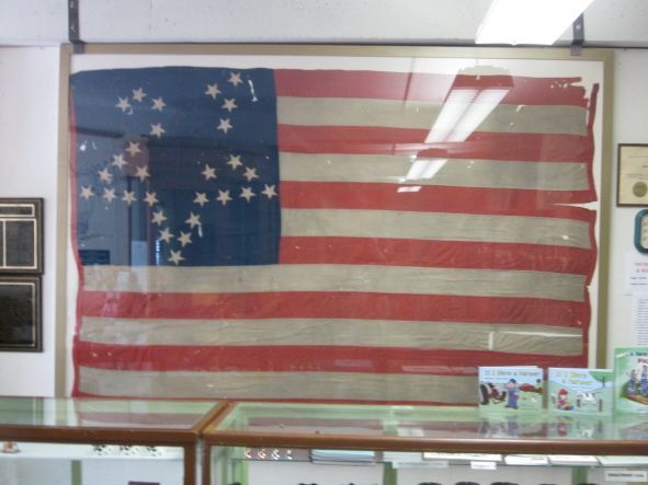 This plaque honors Pvt. West of Mahaska County, believed to be the first Iowan killed in the War, probably of an accidental gunshot discharge. It is located just south of the flagpole at the Nelson Pioneer Farm near Oskaloosa. The Farm has many pioneer buildings and a museum which includes some Civil War items. Also shown is the flag of Company B, 22nd Iowa Infantry on display in the museum. It was recently restored with the help of the 49th Iowa Infantry and the State Historical Society of Iowa. The Farm is located 2 miles northeast of Oskaloosa. Take E. Glendale off HIghway 63 to the Farm. Thanks to David Lamb for notification of this monument. Photos taken 8/7/12.