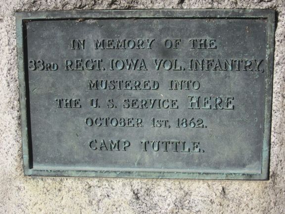 This memorial marks the spot of the muster of the 33rd Iowa Infantry Regiment in 1862. This is a bronze plaque on a boulder. It is in the NW part of town on the Southern Iowa Fairgrounds on the corner of N I Street and G Ave. W. The monument is visible on the right shortly after entering the main gate of the Fairgrounds. There is a reference to Camp Tuttle. This was a Civil War training camp in Oskaloosa. Photos taken 10/9/17.