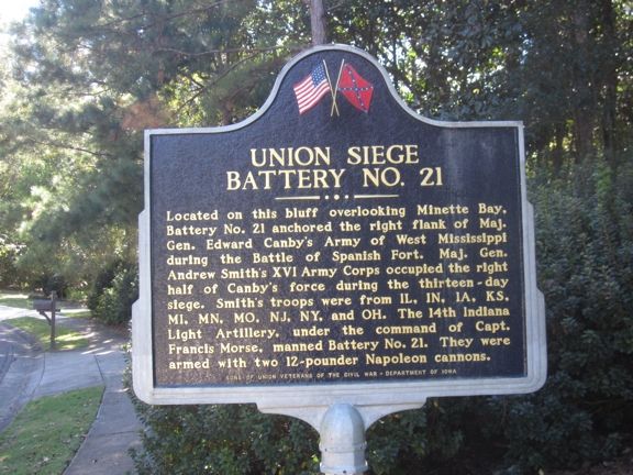 On April 8, 1865, the Union captured the Confederate held Spanish Fort. The attack was led by the 8th Iowa Infantry and Sergeant Edgar Bras of the 8th Iowa received the Medal of Honor for capturing the Confederate flag. Federal Forces had established a siege and extensive fortifications were built. Unfortunately, a housing development has been built over these fortifications. Kirk Barrett has done a wonderful job by establishing a number of historical markers to help visitors better understand the siege and battle. The SUVCW, Iowa Department, helped fund this handsome marker which has information about the 8th Iowa and Sgt. Bras. It is 42 inches wide and 37 inches high with narrative on both sides. It is difficult to locate with winding streets in the housing development - It is on General Canby Loop - follow General Canby Drive to the Loop. Photos taken 10/30/17.