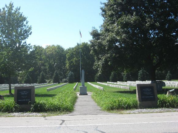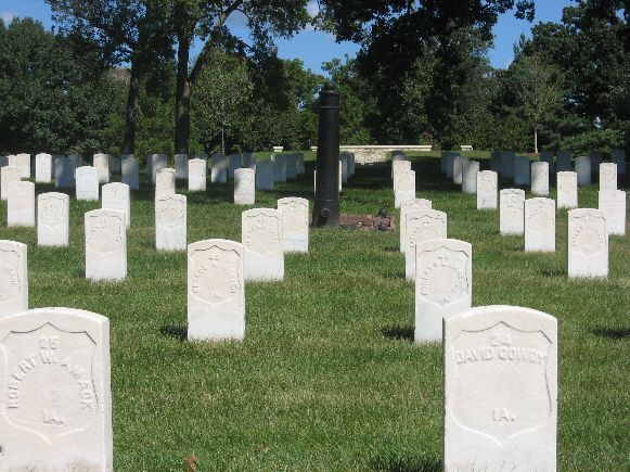 The home of Col. George Davenport (founder of Davenport, Iowa), a replica blockhouse of old Fort Armstrong (1816-1836) and the Mississippi River Visitor Center are also of interest. From I-74, take exit 2 in Illinois - turn west on 7th Avenue - then turn right on 14th Street to the Island. Photos taken 9/9/08. The GPS setting is on the location of Iowa CW Soldiers in the National Cemtery. Thank you to Dustin Oliver for information and the photo for the Original Union Army Grave Site.