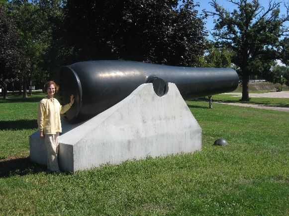 The Rock Island National Cemetery, established in 1863, has many Iowa Civil War soldiers buried here. See the photo below. The Iowa gravestones are located in the SE portion of the cemetery. The second photo shows the Original Union Army Grave Site. It lists the number of men from each unit who were buried there and later moved to the National Cemetery. Many of them were from Iowa regiments. This is located across the street from the National Cemetery, on the edge of the golf course. General Thomas J. Rodman, the inventor of the Rodman cannon, was the second commander of the Rock Island Arsenal and is buried in the National Cemetery. There are three Rodman cannons at his gravesite including the huge one shown below. It weighs 49,612 pounds with a 15" bore diameter and was cast at Seyfert, McManus & Co. of Reading, PA in 1864.