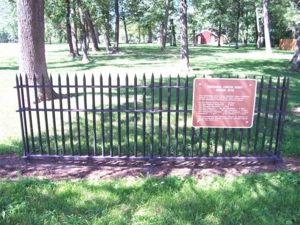 During the war, a prison for Confederate soldiers was located on the island. The 1864 prisoners who died there are buried here on the location of the prison. See the photo below. The prison became somewhat notorious as the "Andersonville of the North" but actually was no worse than other northern prisons and much better than Andersonville. There is an Iowa connection as the famous 37th Iowa Infantry Regiment "The Graybeard Regiment" guarded the prisoners from January to June of 1864. The regiment was composed of men age 45 and older and were assigned guard and garrison duty. Whether justified or not, the prison commander was critical of the lack of discipline and overall performance of the Graybeards.