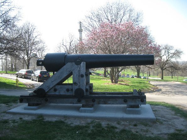 There is a large cannon in the Hazelwood Cemetery in Grinnell. The cannon is a 6.4-inch Navy Parrott rifle made at the West Point Foundry in 1863. The cemetery, 120 1st Ave. W, is in the SW area of town. Take 1st Avenue west from Highway 146 to the cemetery. The cannon is located on top of a hill to the right shortly after entering the cemetery. Photos taken 10/8/17.
