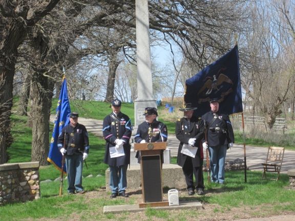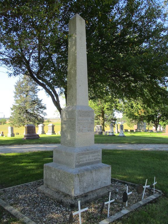 This memorial is in Oakland Cemetery in the north section of Sac City. It is an 18 foot obelisk dedicated in 1906. Besides the inscription shown on the south side of the monument in the photo - the east side says ""Soldiers Sailors Citizens" - north side "May the Remembrance of their Valor and Patriotism be Perpetuated" "presented September 1, 1906" - west side "General W T Sherman Post No 284." Go north on 5th Street - after crossing the river, turn left at the 3rd cemetery entrance - then bear right or NW and drive a distance until you come to the monument. The first 2 photos were taken 9/22/21. The final photos were taken 5/4/14 at a monument re-dedication ceremony led by members of the Kinsman SUVCW Camp. This includes a cannon salute by the 2nd Battery Iowa Light Artillery of Sac City.