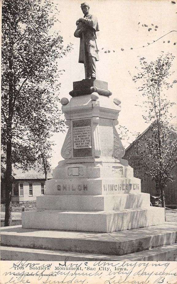 This is a bronze soldier with a granite base. The height is 20 feet. It is in a nice setting in Monumental Square, a small city park just across the street from the Courthouse. There are 20 names of soldiers from Sac County inscribed on three sides of the monument - one of these is shown below. It was built at a cost of $3472 and dedicated November 21, 1894. There are four 105mm Howitzers M3A around the monument - these are WWII cannons. Originally there were CW cannons - see the old postcard. They no doubt were scrapped during WWII and later replaced with the WWII howitzers. It is located just east of the business district on Highway 20. Also see the separate listing for the GAR Hall just west of the monument. Photos of the monument were taken 9/22/21 - photos of the howitzers were taken 2/24/09. Thank you to Danny Krock and David Shedlock for providing copies of the old undated postcards.