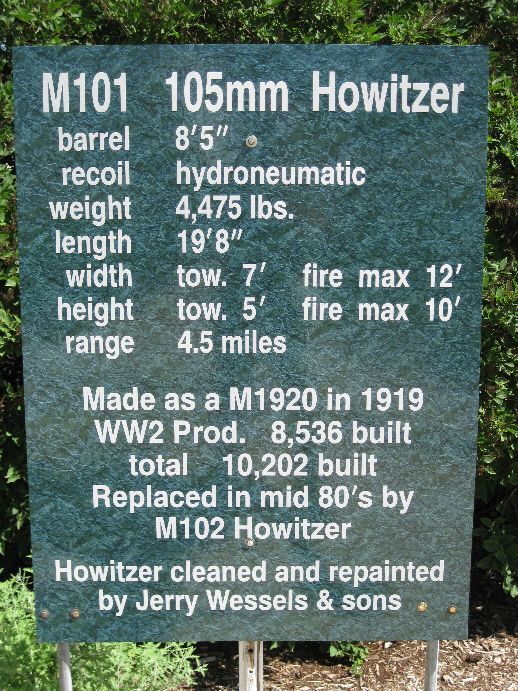Close to the monument is a very well maintained 105mm Howitzer, M101, a WWII era cannon. The park is in the center of town - the monument and cannon are near Bush and Pine Steets. Photos were taken 7/11/09.