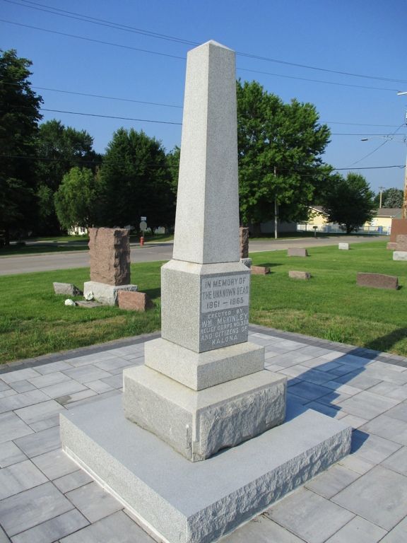 This is a nice 10 foot granite obelisk in Sharon Hill Cemetery in Kalona. The inscription says, “In memory of the unknown dead 1861 - 1865.” It is on the north side of town – take 3rd Street north to J Avenue and the monument is visible from the street. Photos taken 7/8/20.