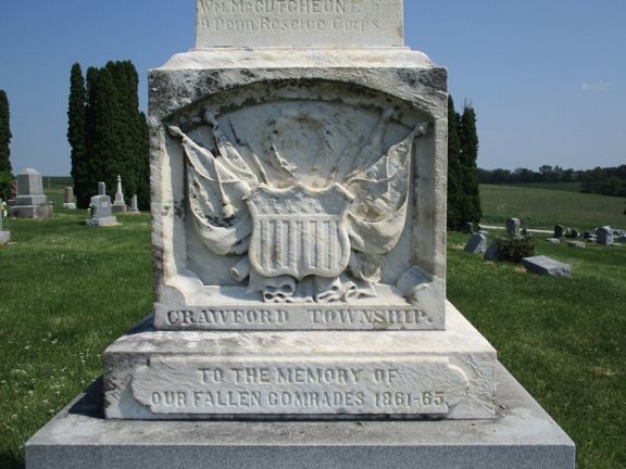 This attractive Civil War monument has about 160 veterans inscribed on 4 sides. It is made of marble and stands about 15 feet high. It is west of town on Road G6W – note that there are two cemeteries and this is the furthest west. Photos taken 7/8/20.